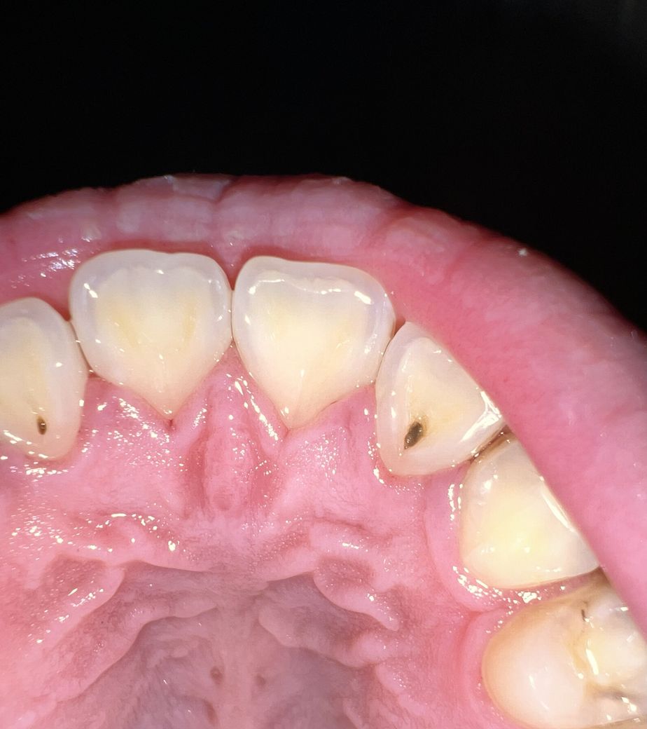충치는 3개로 보입니다. 두번째 앞니와 송곳니사이 인접면도 충치가 의심되나 침이 고여있어 정확하게 보이지 않습니다.