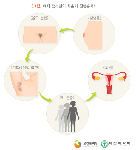 질문하신 내용에 대하여 아래와 같이 답변 드립니다.여성의 경우 사춘기 변화가 시작되고,