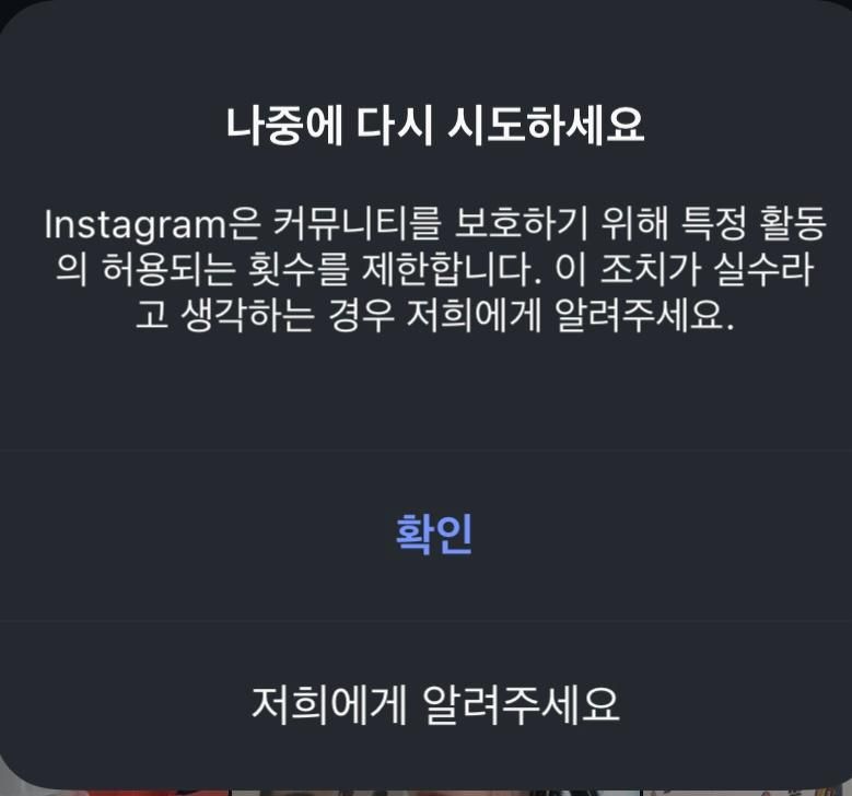 인스타그램에서 같은 행위를 연속으로 하게 되면 그런 문구가 뜨는것 같습니다. 일명 매크로라고 하는것을 걸러내기 위함인데요. 비정상행위인것이라고 판단하는것같습니다.
