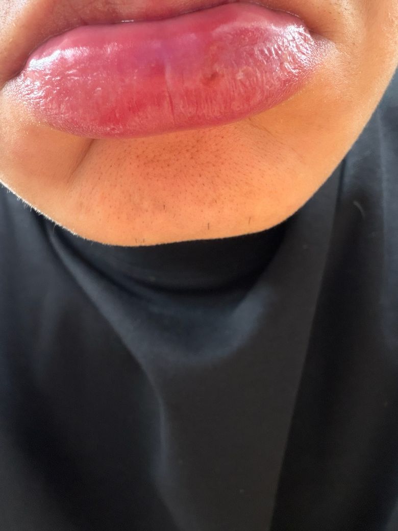 사진에서 보이는 양상은 입술 점막의 건조·자극으로 인한 미세 출혈 후 생긴 딱지(혈가피) 가능성이 가장 높습니다.