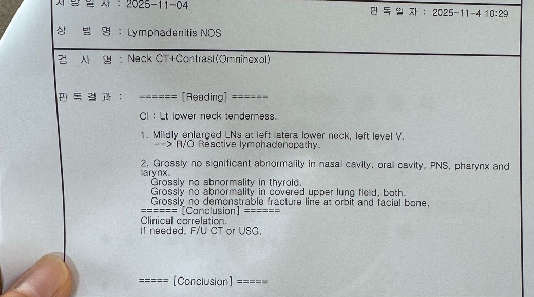 목에 멍울때문에 CT찍었는데요 판독 부탁드려요