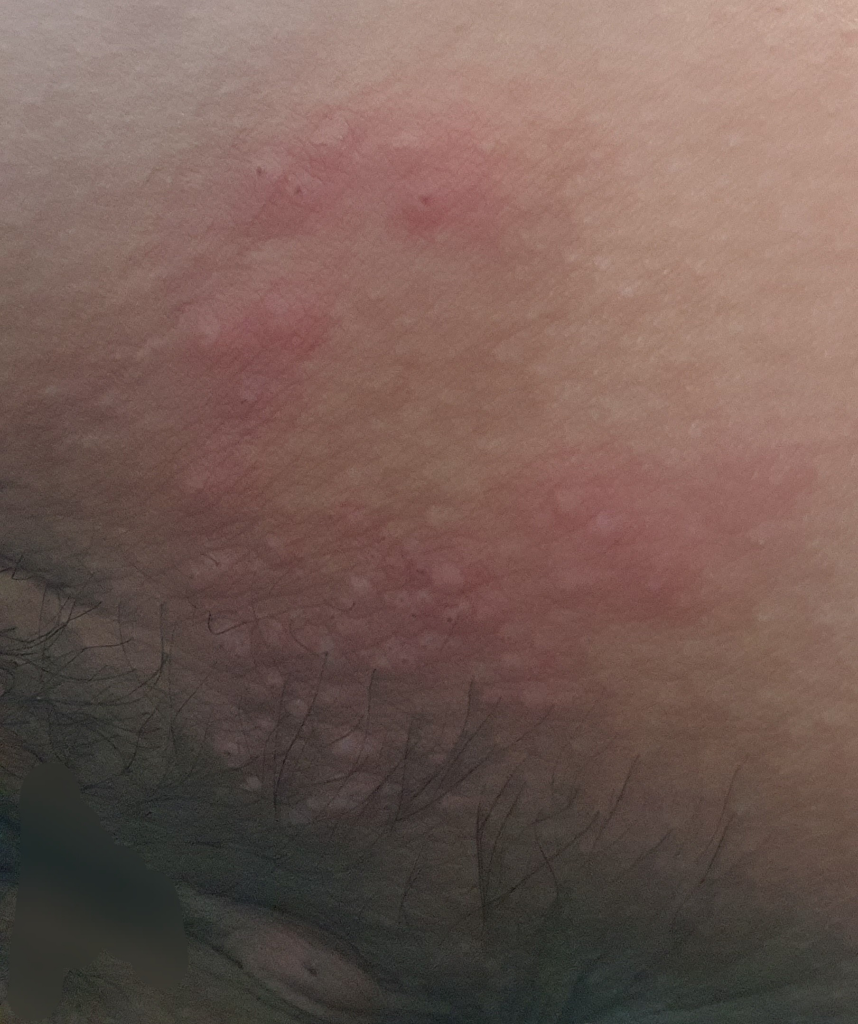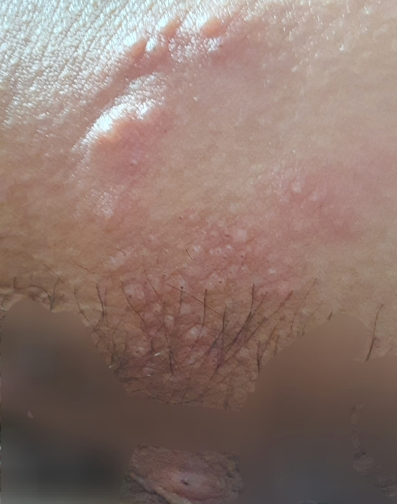 군집을 이룬 수포의 모습을 보이고 있어 대상포진을 의심해보아야 할 것이라 예상됩니다. 피부과나 산부인과를 방문해 진료받아보시는 것이 좋겠습니다.