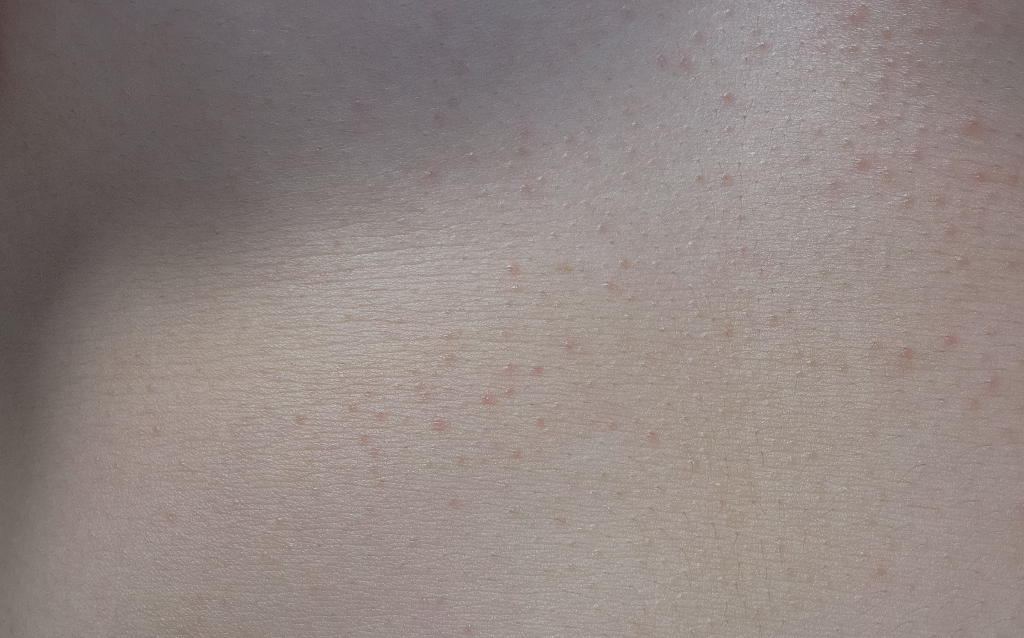 사진으로 보아 모공각화증이 의심되는데, 유전적 소인이 있는 사람이 때를 세게 밀거나 피부 자극을 반복적으로 주는 경우에 발생할 수 있습니다. 연고는 아무것도 사용하지 마시고 평소 몸에 바르던 보습제의 양을 두배정도 늘려서 충분히 발라주시기 바랍니다. 시간이 지나도 호전이 없는 경우에 피부과를 방문해보시기 바랍니다.