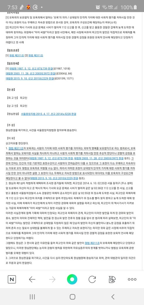 피고인의 위 “아이 씨발!”이라는 발언은 구체적으로 상대방을 지칭하지 않은 채 단순히 발언자 자신의 불만이나 분노한 감정을 표출하기 위하여 흔히 쓰는 말로서 상대방을 불쾌하게 할 수 있는 무례하고 저속한 표현이기는 하지만 위와 같은 사정에 비추어 직접적으로 피해자를 특정하여 그의 인격적 가치에 대한 사회적 평가를 저하시킬 만한 경멸적 감정을 표현한 모욕적 언사에 해당한다고 단정하기는 어렵다고 한 것입니다.
