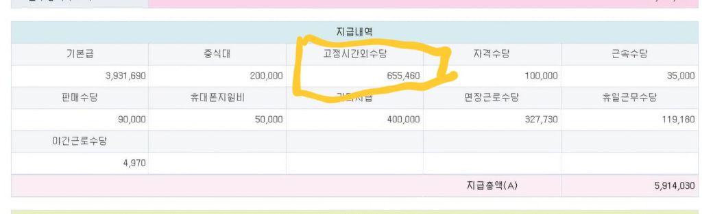 고정시간외수당은 매일 1시간 OT로 입니다.