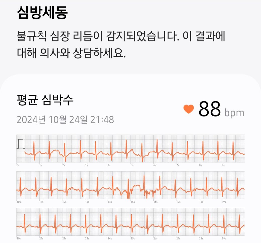 측심 심박이 빨리졌다고 느껴지긴한데 오늘 음주후 워치로 측정해본결과 심방세동이 측정되었습니다. 결과가 정말 심방세동이 의심되는 그래프인가요?