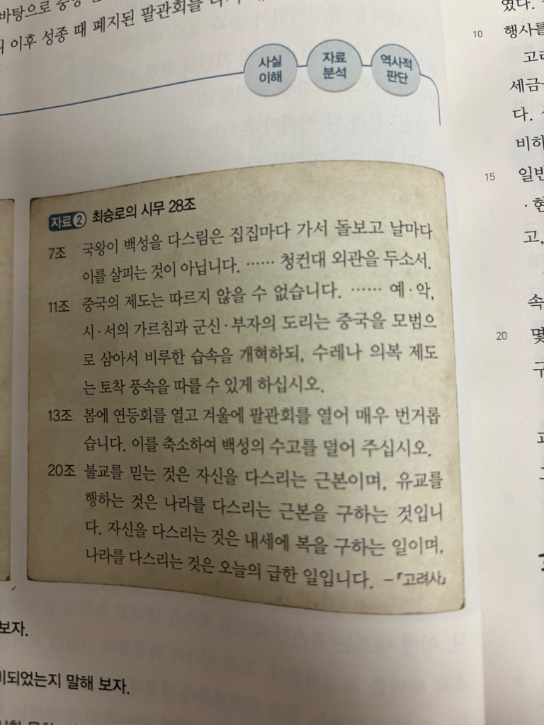 최승로의 시무 28조는 성종의 개혁에 반영되었습니다. 7조의 외관 파견 주장으로 성종은 주요 지역에 12목을 설치하였습니다. 11조의 주장과 같이 자주적 국정을 운영을 강조하기도 했어요. 그리고 13조의 주장을 수용하여 불교 행사가 억제되고, 팔관회가 폐지되었습니다. 20조와 같이 유교를 중시하여 국자감을 중수하고, 지방에 경학박사를 파견하여 교육을 진흥하여 유교를 바탕으로 하는 문치주의 전통이 수립될 수 있었어요.