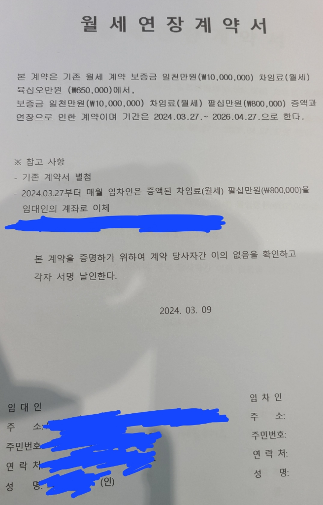 24.03.03 월세 인상 80에 2년 연장으로 동의하였습니다