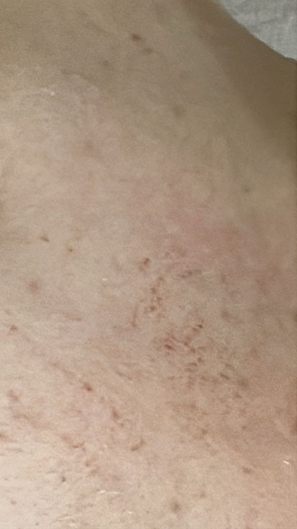분명 어제 낮에만 해도 없었는데 오늘 샤워하기 전에 보니 발진 같은 게 있어요. 간지럽거나 통증은 없고요. 이 부위를 어딘가에 긁히거나 맞은 적도 없습니다. 이틀 전에 소주 2병, 어제 밤 350ml 캔맥주를 마셨는데 음주가 원인일까요?