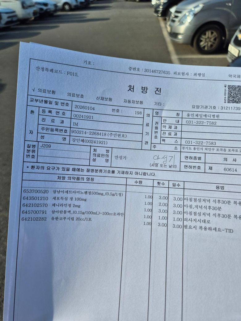 사진에 보이는 처방은 임신 32주 기준에서 일반적으로 사용 가능한 약들로 구성돼 있습니다. 해열진통제인 아세트아미노펜은 임신 후기에도 비교적 안전한 약이고, 항히스타민제(페니라민)는 졸림은 있을 수 있으나 임신 중 흔히 사용됩니다. 가글액(벤지다민 성분)은 국소 작용으로 전신 흡수가 거의 없어 안전한 편이고, 기침시럽도 임산부 진료 전제로 처방된 경우 보통 문제 없이 복용합니다. 항생제가 포함돼 있다면 임신 중 사용 가능한 계열을 선택했을 가능성이 높습니다. 열이 없고 증상이 주된 경우라면 처방 용법대로 복용해도 되며, 다만 복용 후 심한 졸림·두근거림·복통 등이 있으면 중단하고 다시 진료를 받는 것이 좋습니다.