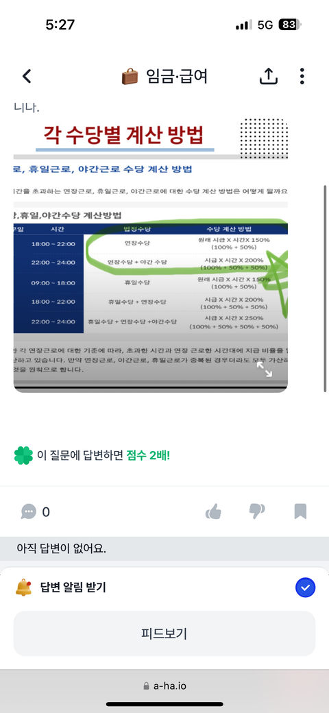 2교대 생활시설 근무중입니다. 야간수당 좀 정확히 알려주세요.
