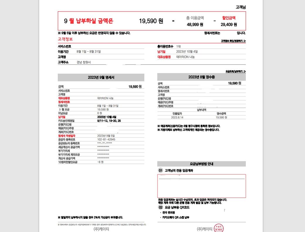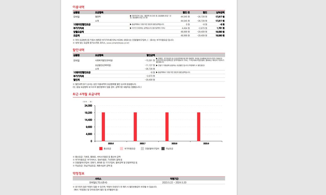 월 19,590원입니다. 할인 적용되는 내용은 캡쳐 첨부하겠습니다.