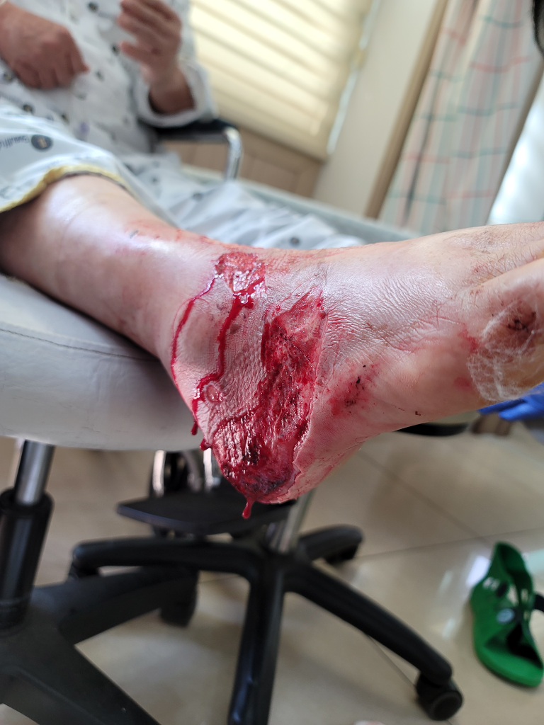 피하지방층까지 침범한 상태로 3도 화상으로 보입니다. 다행히 중요한 신경 및 혈관의 손상이 있을 정도로 깊어 보이지는 않습니다.
