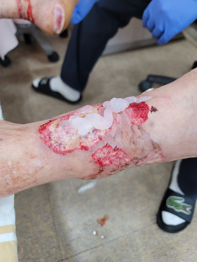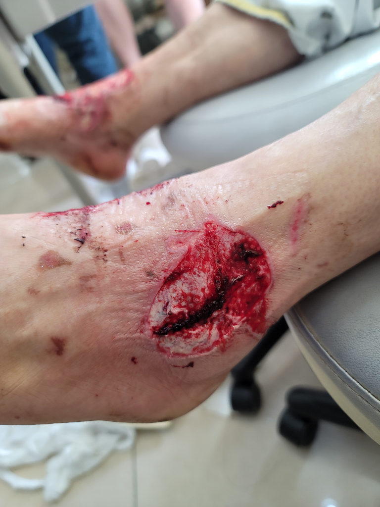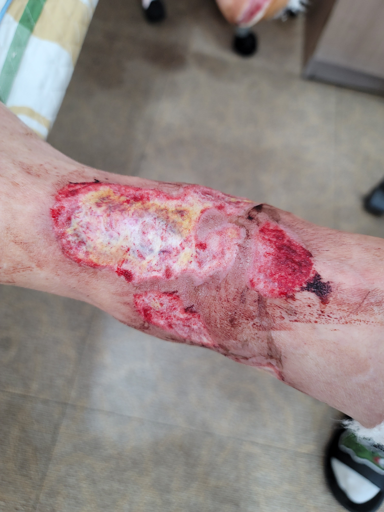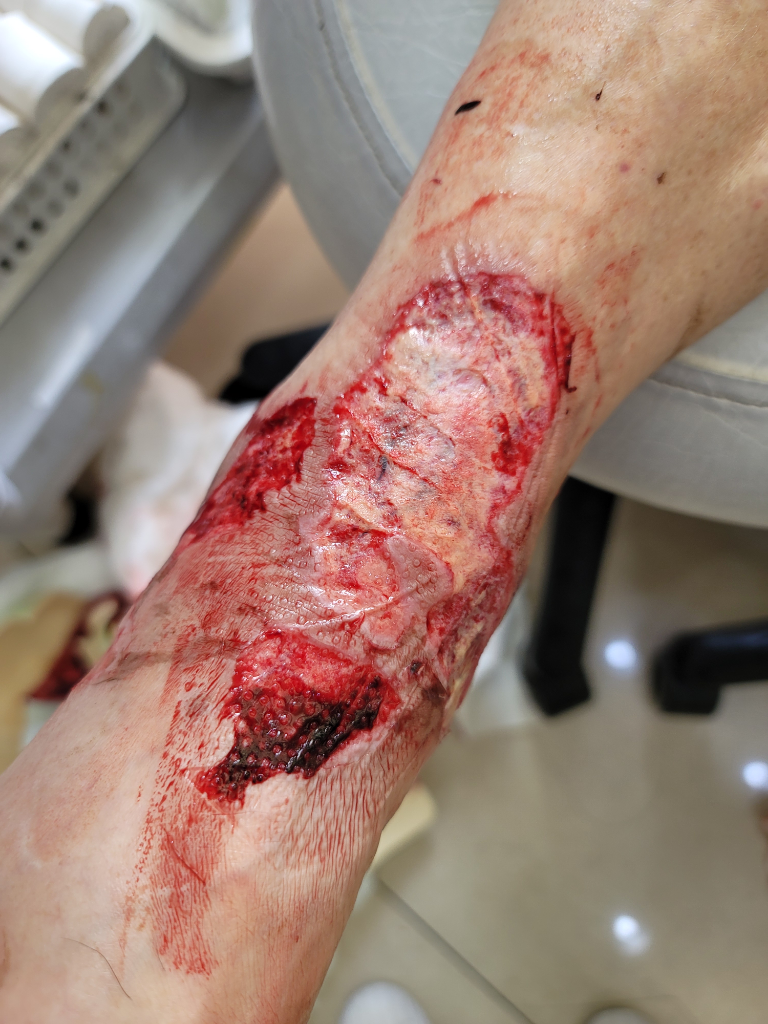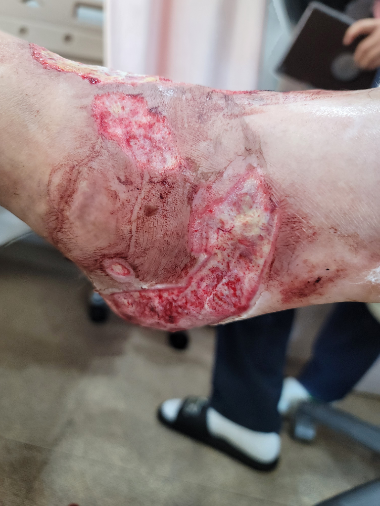 현재 화상 부위는 적어도 심재성 2도 혹은 3도에 가까운 화상으로 보입니다. 표피가 박탈된 범위가 크기 때문에 회복에도 상당한 시일이 소요될것으로 보이며 피부가 재생되는데는 충분한 영양공급이 필수적입니다.