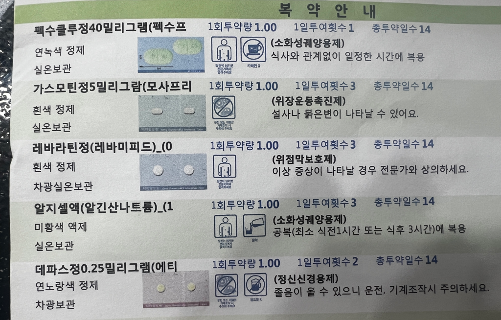 펙수클루정 / 가스모틴 / 레바라틴정 / 데파스정0.25mg / 알지셀액을