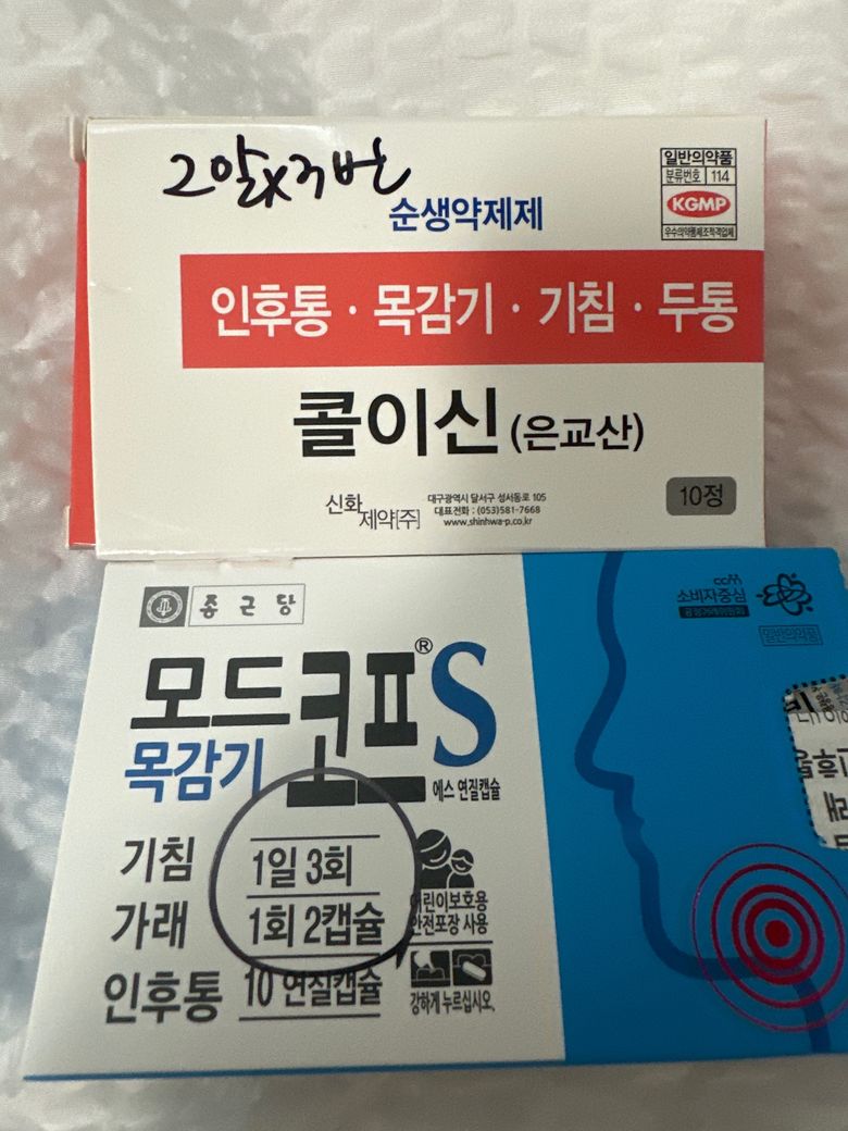 콜이신 2알, 모드코프s 2알 이렇게 먹으라고 하셨어요! 약을 제가 구매한게 아니라 약사님께 여쭤보지 못했어요ㅜ