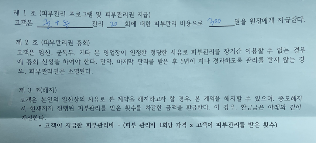 피부관리실 약손명가 환불 계약서
