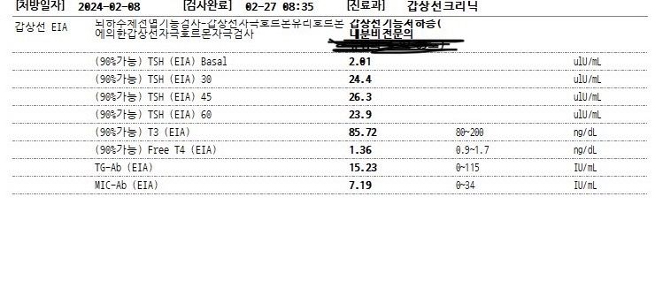 TSH가 제대로 분비되는지 TSH 분비를 자극하는 또 다른 호르몬을 주입해서 테스트 한 것이구요