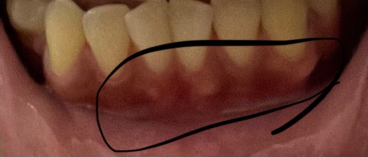 잇몸뼈입니다. 해당 부위는 보이는 쪽의 잇몸뼈와 치아가 상당히 가까워서 연조직을 잡아당기면 지금과 같이 치조골이 직접적으로 보일 수 있습니다. 다만 지금처럼 입술을 당기지 않으면 치조골이 비춰보이지 않습니다. 구내염이 아닌 정상적인 치조골이라고 보시면 됩니다.