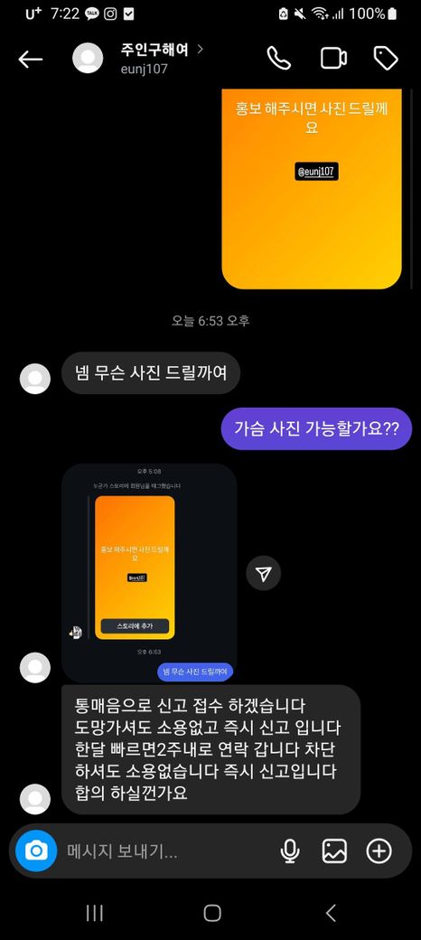위에 보이는거와 같이 아이디도 주인님 구해요 입니다 그리고 스토리 홍보를 하면 성적인 사진을 주는거와 같이 적어 놓고 홍보를 해주고 몇 시간 뒤에 어떤 사진 들리까요라고 물어보시길래 ㄱㅅ 사진을 주실 수 있냐고 물어봤는데 바로 통매음으로 신고 한다고 하시더라고요 통매음헌터 아닌가요? 신고 가능성은 얼마나 있는걸까요..