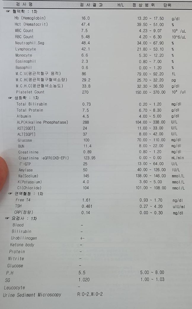 이미지에 보이는 항목은 일반적인 혈액검사(complete blood count)에 해당합니다. 구체적으로는 헤마토크릿(Hct), 백혈구(WBC), 적혈구(RBC), 호중구, 림프구, 단핵구 등의 수치입니다.
