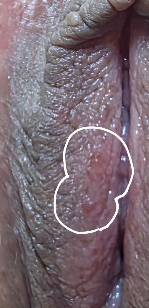 사진에서 보이는 병변은 작은 수포들이 군집한 전형적인 형태라기보다는, 한 부위가 붉어지고 표면이 벗겨진 미란 형태에 가깝습니다. 다만 증상 자체가 “갑작스러운 따가움 + 물 닿을 때 통증”이라는 점은 외음부 단순포진(헤르페스)에서 흔히 보이는 양상과 일부 일치합니다.