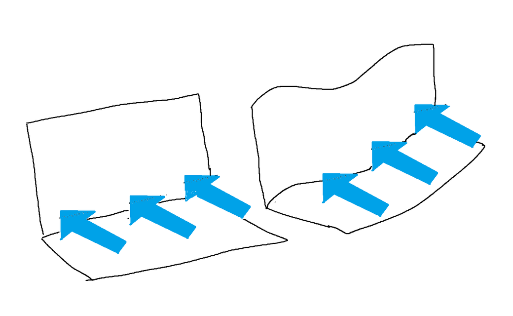 충격 분산의 차이를 설명할 수 있는 물리적 원리 중 하나는 압력 분포입니다. 압력은 힘이 면적에 대해 분산되는 방식을 설명하며, 압력 P은 힘 F과 면적 A의 비율로 정의됩니다 :