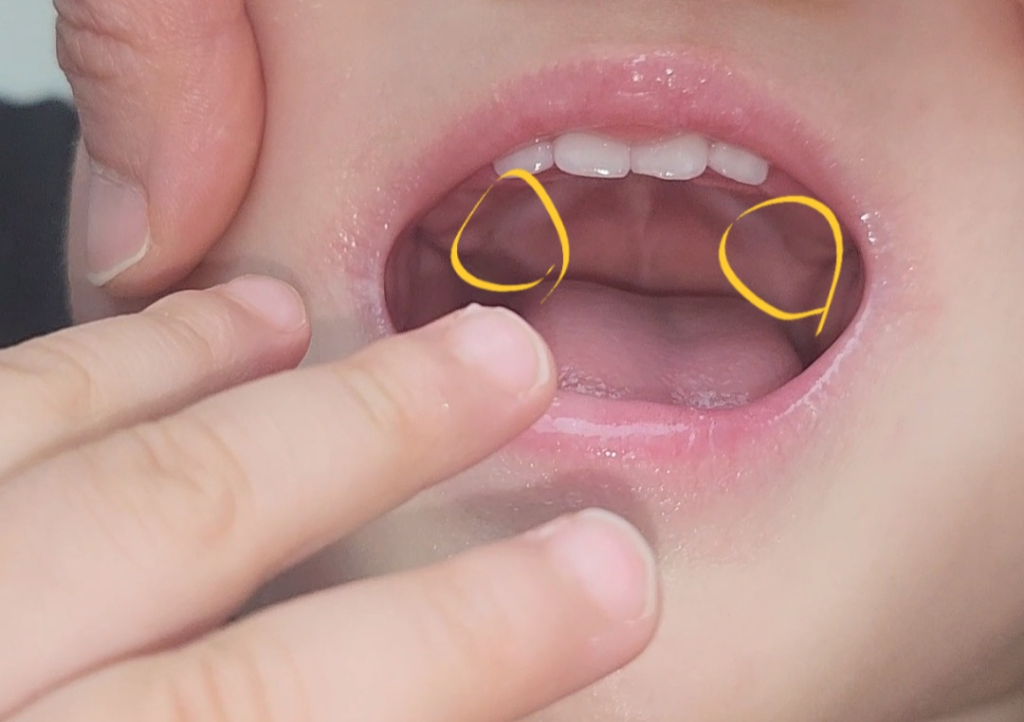 잇몸안쪽에서 유치 어금니가 자라고 있어서 그럴 수 있습니다 치아 형태가 잇몸에서 드러나서 그렇게 보일 수 있습니다