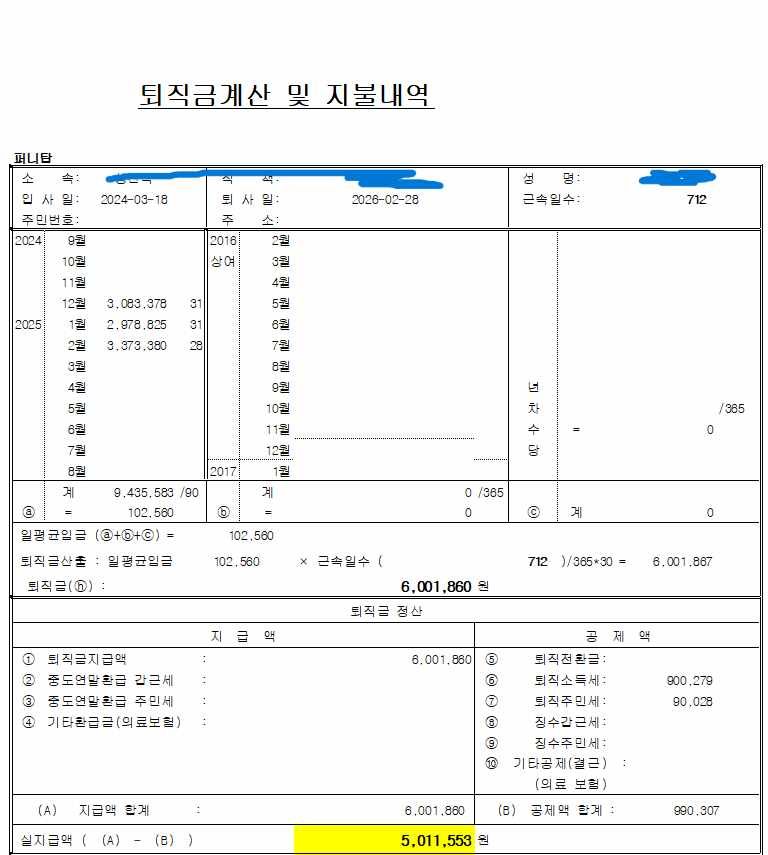 공제된 금액(약 99만원)은 전체 퇴직금의 약 16.5% 수준입니다. 이는 퇴직소득세율이 지방소득세를 포함하여 기본적으로 6%~45%의 누진세율을 적용받기 때문에, 연봉 수준과 퇴직금 규모에 따라 충분히 발생할 수 있는 금액입니다.