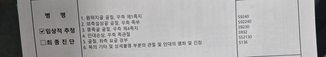 좌측 팔 골절,우측 발가락 골절에 대한 병명입니다
