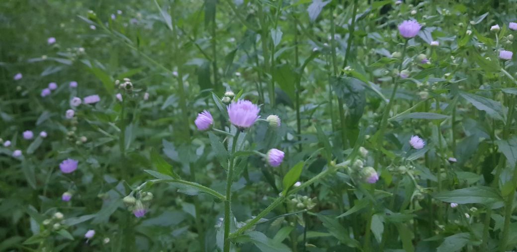 사진 속 꽃은 벌개미취(학명: Aster koraiensis)로 보이는데요, 이 꽃은 국화과에 속하는 여러해살이풀로, 우리나라 들판이나 산기슭에서 자주 볼 수 있는 야생화입니다. 일반적으로 늦여름부터 가을까지 꽃을 피우며, 사진 속처럼 작고 연한 보랏빛 또는 자주색 꽃잎이 모여 둥글게 피는 것이 특징입니다. 벌개미취는 줄기가 곧게 자라고 잎은 길쭉한 타원형이며, 꽃은 중심부에 노란색 암술과 수술이 있고 주변에 보라색 꽃잎이 방사형으로 펼쳐져 있어서 국화와 비슷한 형태를 띕니다. 특히 사진처럼 줄기마다 여러 개의 꽃봉오리를 맺고, 일부는 피어 있고 일부는 아직 피지 않은 상태로 있는 경우가 많습니다. 또한 이 식물은 특별한 관리 없이도 잘 자라기 때문에 정원이나 공원에서도 종종 심어지며, 벌과 나비가 좋아하는 꽃이기도 해서 생태적으로도 도움이 됩니다. 주변이 초록빛으로 풍성한 것을 보면 자연 상태에서 건강하게 자라고 있는 것으로 보이며, 꽃의 색과 모양, 잎의 형태로 보아 벌개미취일 가능성이 높습니다.