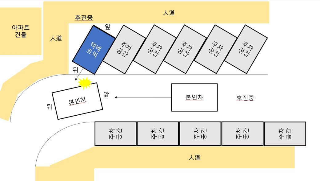 주차공간을 다 지나고 곡선차선에 진입하는 도중에 택배차량이 후진하며 운전자석 문에 접촉(견적서 약 70만원)
