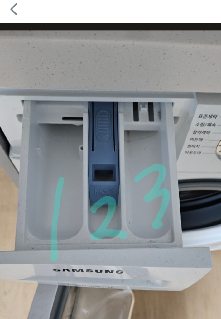 그 버튼 누를 때 어디에(사진에 숫자 적어놨어요) 세제랑 섬유유연제 넣나요?
