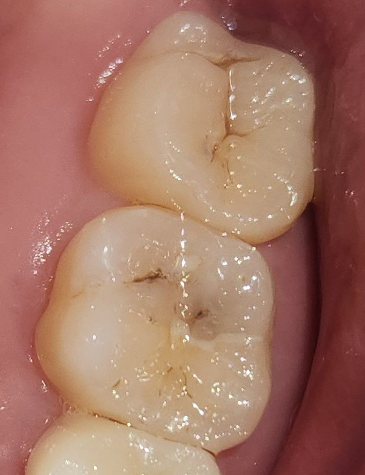 사진으로 봤을 경우에는 치아에 물리는 면에 충치가 있는 것으로 보입니다 충치가 있다면 충치를 치료해 주는 것이 좋습니다 그렇지 않다면 해당 부위에 이물질이 끼게 되어 충치가 더 진행될 수 있기 때문입니다.