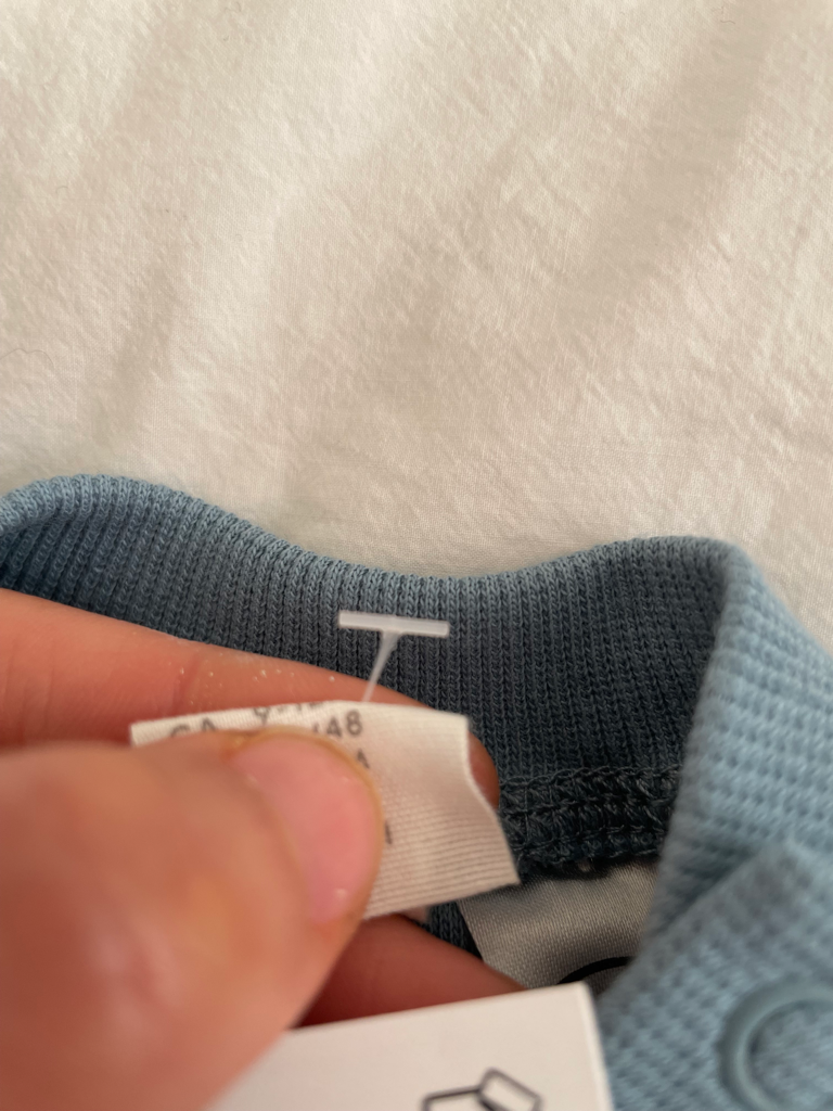 사진에는 옷에 부착된 라벨의 일부가 보이며, 이는 아기가 가지고 놀았을 수 있는 작은 물체의 일부로 보입니다. 1센티미터 정도의 크기라면, 아이가 이를 삼켜도 대부분의 경우 소화 시스템을 통해 자연스럽게 배출될 가능성이 높습니다. 아기가 잘 먹고, 활동적이며, 정상적인 대변을 보고 있다면 급성 위험의 징후는 아닐 수 있습니다.