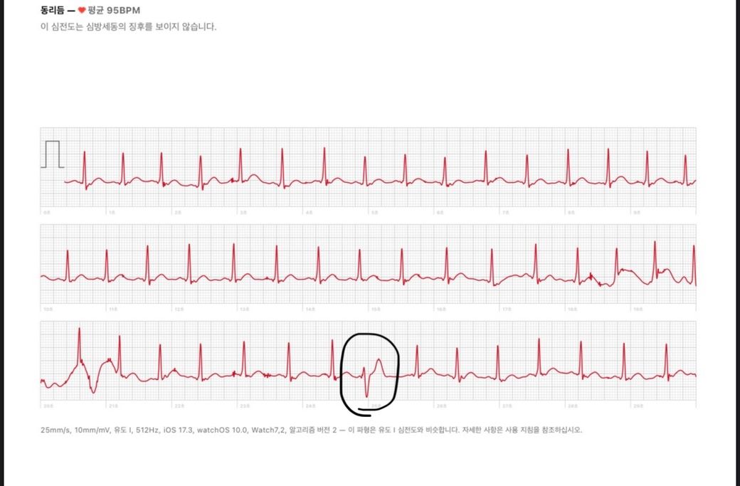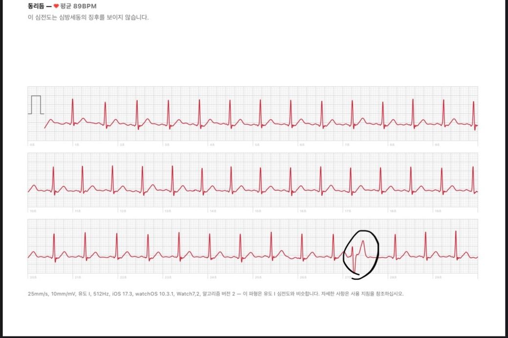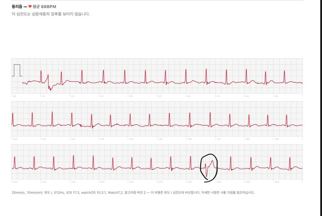평소 심장이 철렁일때가 있는데 애플워치로 심전도 체크를 하면 그때마다 저런형태의 그래프가 나타납니다.