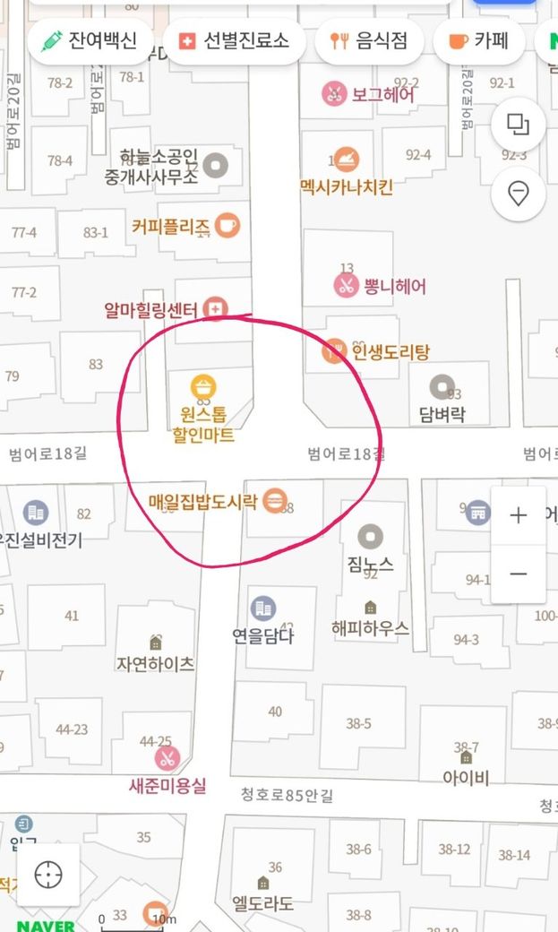 그 2개의 도로가 교차하는 경우 '십'자로, 소위 사거리라고 보이기는 하나 동그라미의 부분의 'T'자로가 약간의 이격이 있어 삼거리로 판단할 가능성이 있습니다.