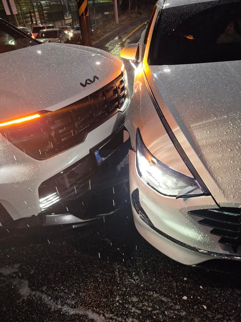 사거리에서 남친이 좌회전 신호를 받고 최대시속 12km로 서행 중에 직선 차선 차랑이 사진처럼 (남친 차 좌측 차량 오른쪽 차가 가해자 차량) 좌회전 하자마자 가해자 차량과 이렇게 박았습니다