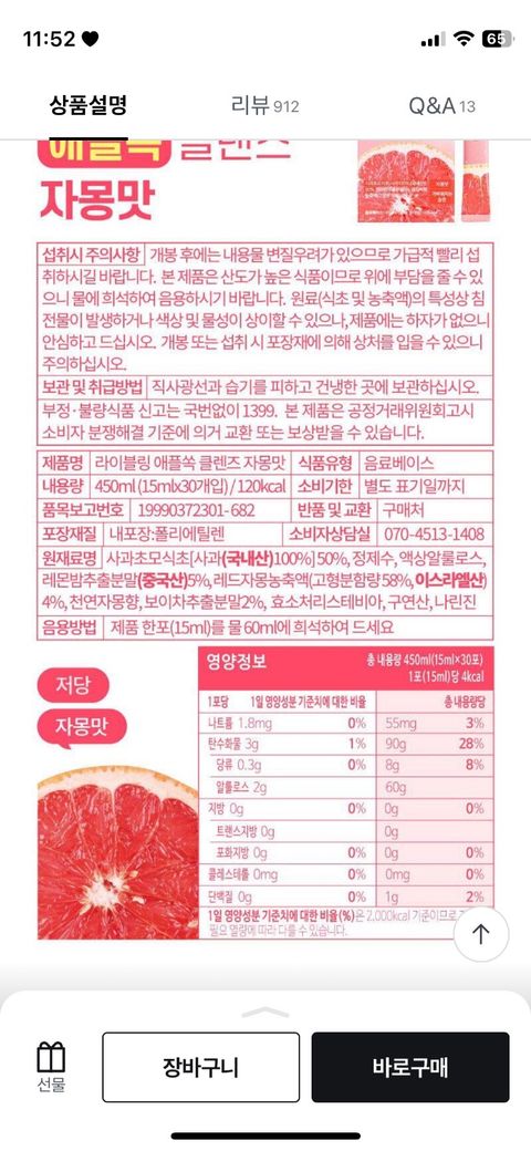 사진은 자몽맛 애사비 성분표와 1포에 들어있는 자몽 함유량 입니다 !