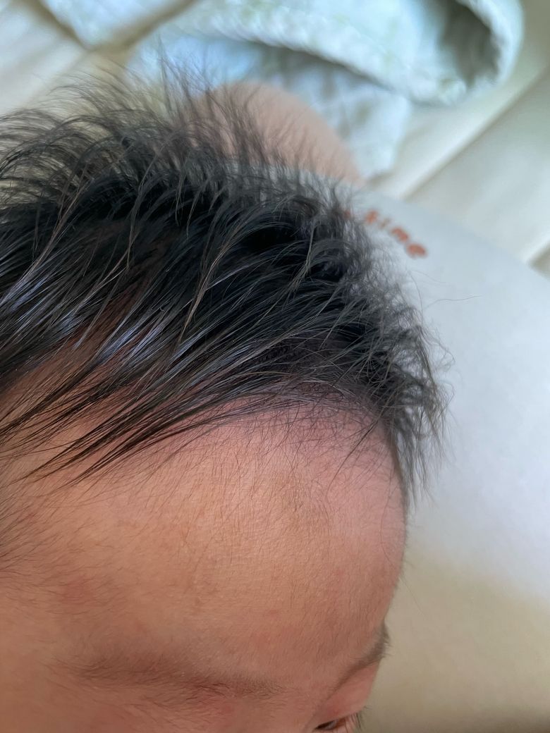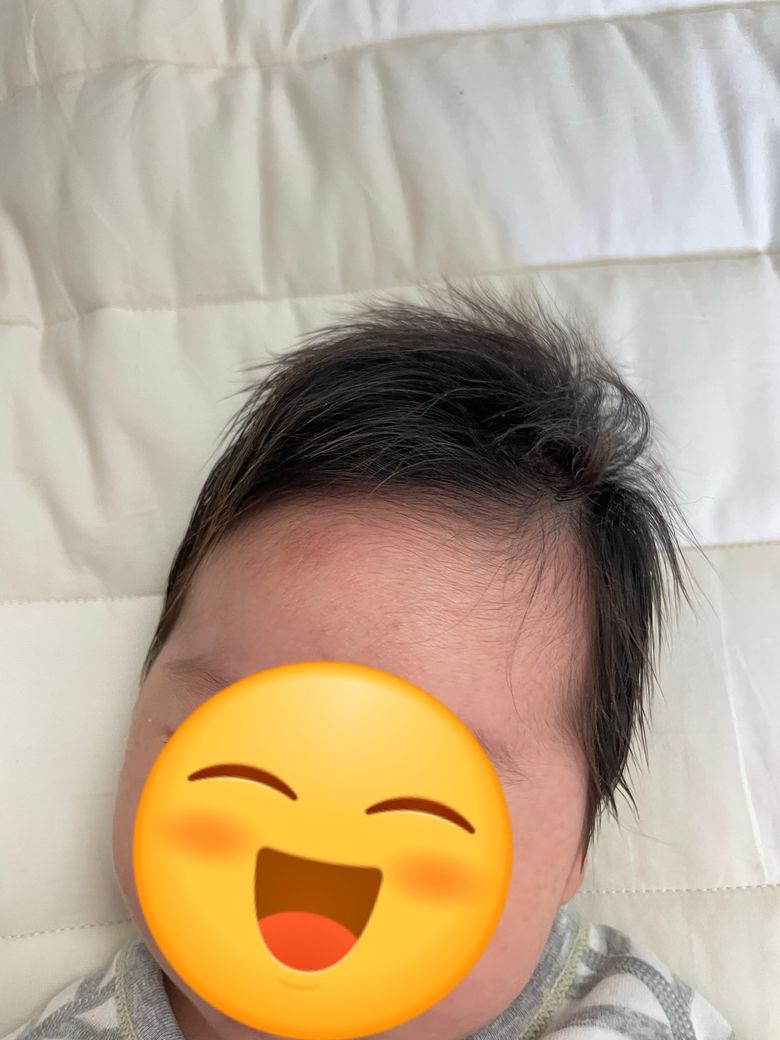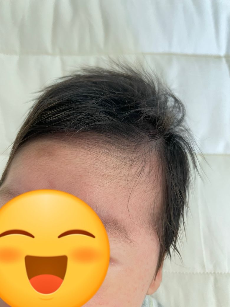사진상 이마 좌측 상부에 연한 갈색의 비교적 경계가 완만한 색소침착이 관찰되며, 형태와 색조만 놓고 보면 밀크커피반점(café-au-lait macule)과 감별이 필요한 소견으로 보입니다. 다만 단일 사진만으로 확진은 어렵고, 영아에서는 일시적인 색소 변화(마찰, 피부 자극 후 색소침착, 신생아기 색소반)도 비교적 흔합니다.