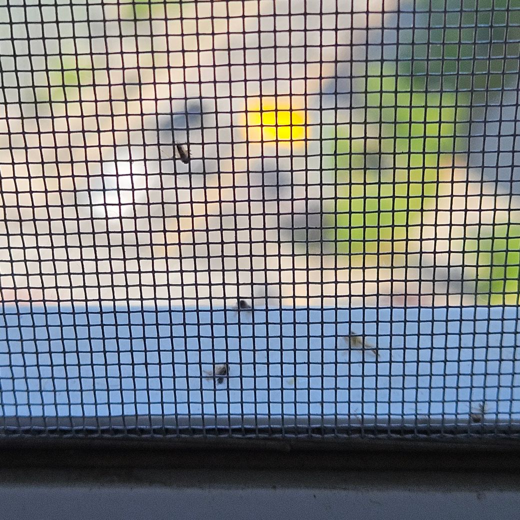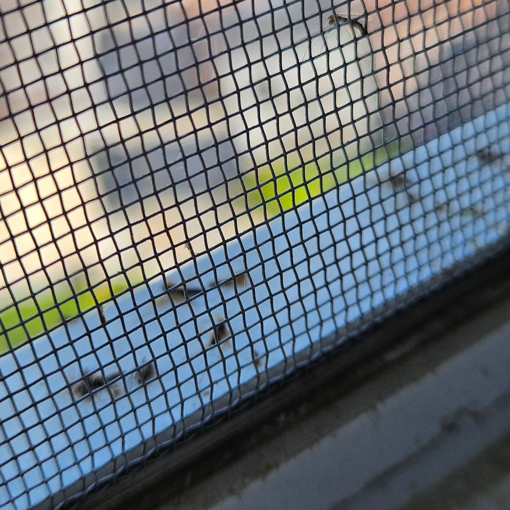 안녕하세요. 김지호 박사입니다. 방충망에 붙어서 잘 보이지는 않지만 크기로 봤을 때 하루살이나 깔따구인 것으로 추정됩니다. 방충망 구멍에 끼었다가 빠져나가지 못해저 죽은 것으로 보이며, 밤에 실내 불을 켜 놓을 경우 불빛을 보고 창문에 달려들어서 더 많이 몰려든 것 같습니다.