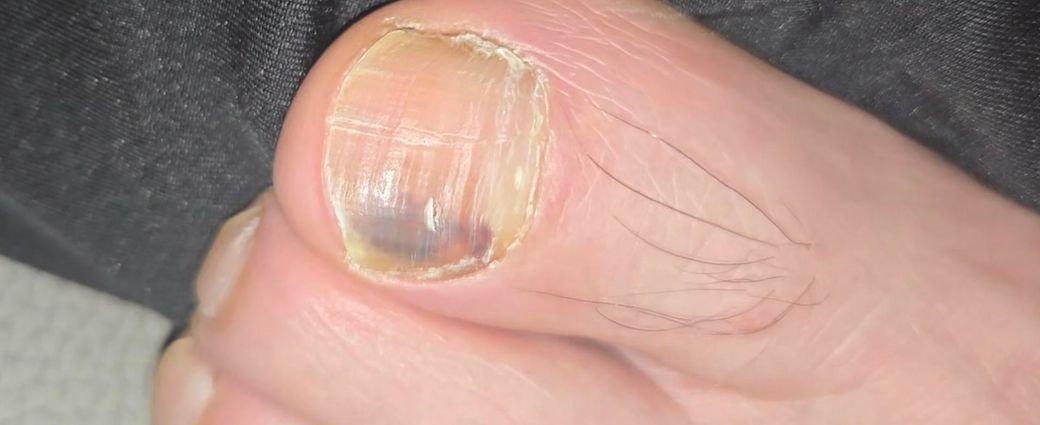 사진상 병변은 발톱 하부에 국한된 검붉은 색조이며, 경계가 비교적 흐리고 한쪽에 치우쳐 있는 형태입니다. 임상적으로 가장 흔한 원인은 외상에 의한 조갑하 혈종입니다. 러닝 등 반복적인 미세 외상으로도 발생할 수 있고, 통증이 없는 경우도 드물지 않습니다. 보통 시간이 지나면서 발톱이 자라며 위쪽으로 이동하는 양상을 보입니다.