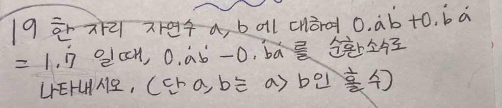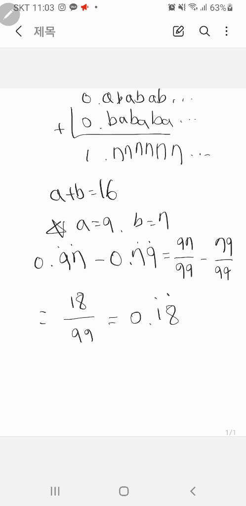 1의자리가 생겼으니까 a+b가 10이 넘는다는거잖아요. 1올린다 생각하고 1.777..이 되게 하려면 a+b가 16이 되고 a>b인 홀수니까 a,b는 구해졌고..그래서 순환소수 뺠셈하려면 분수로 바꿔야하니까 바꿔서 뺀 후에 다시 순화소수로 바꾸니 0.181818...이렇게 나오네요. 아마 맞을꺼예요