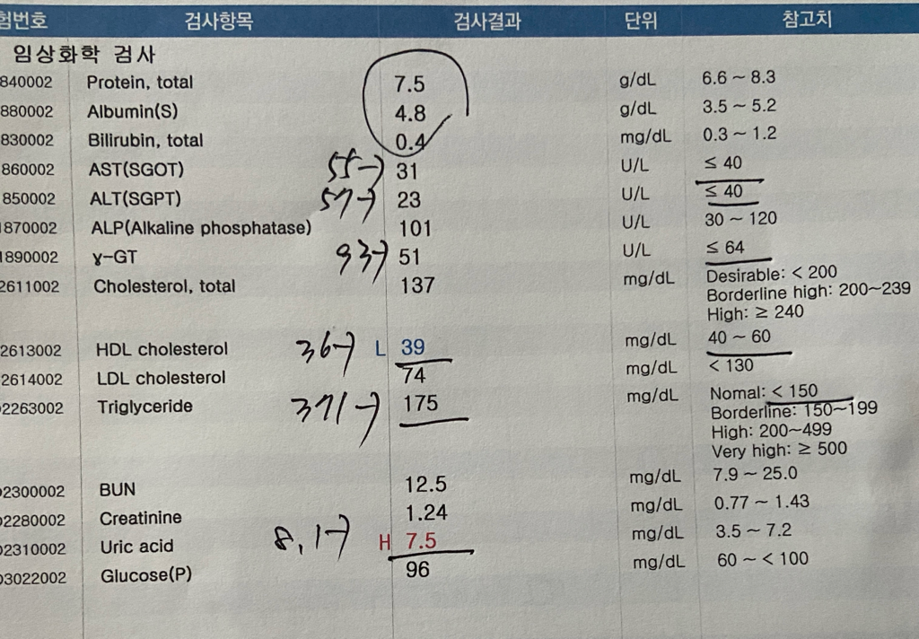 중성지방도 많이 좋아지셨는데 하루 섭취 칼로리를 줄이고 체중조절, 하루 30분 이상 운동 해주시면 더 좋아지실겁니다.