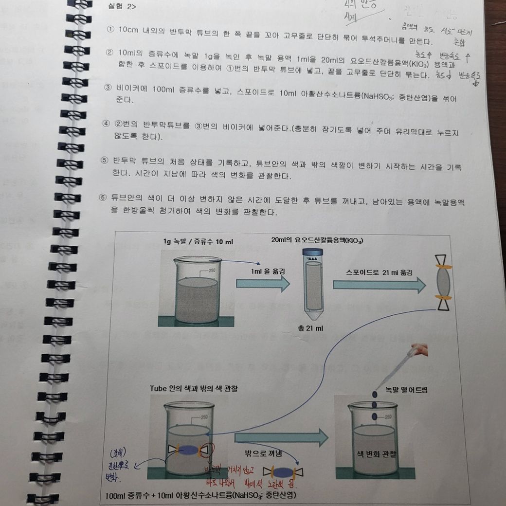 사진에 실험을 왜 하는지, 2. 시계반응? 그거랑 연관이 있다고 써놨는데 왜 관련이 있는지 3. 이 실험이 투석원리를 이해하는데 어떤 역할을 하는지 알랴주세요
