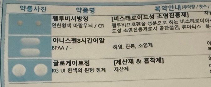 현재 복용하시는 약은 펠루비서방정(펠루비프로펜), 아니스펜8시간이알서방정(아세트아미노펜), 글로게이트정(알마게이트) 성분입니다.