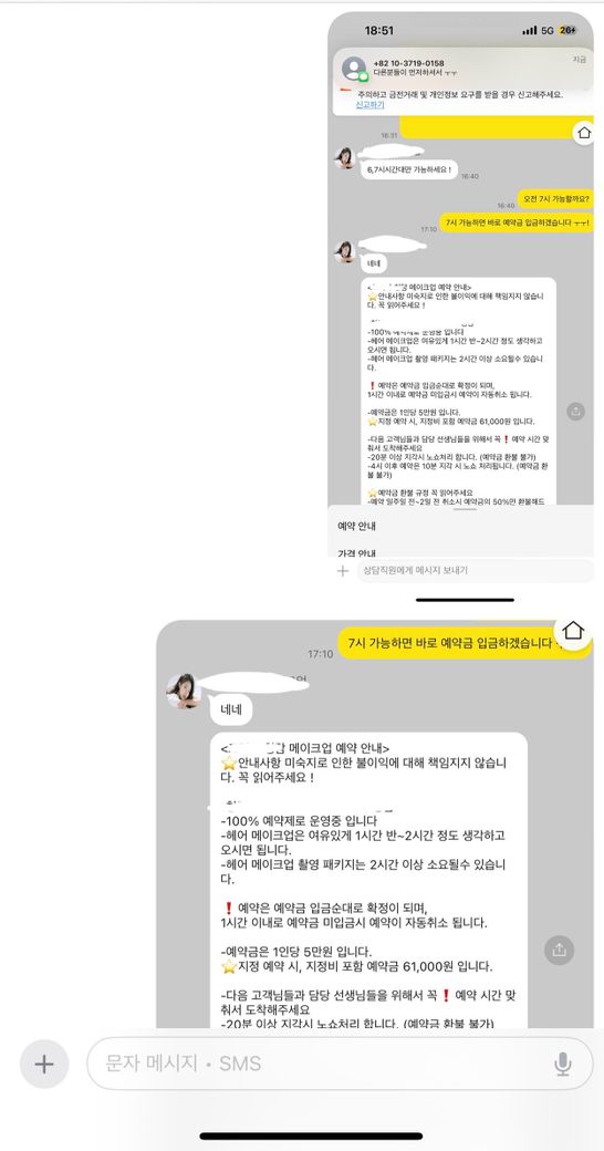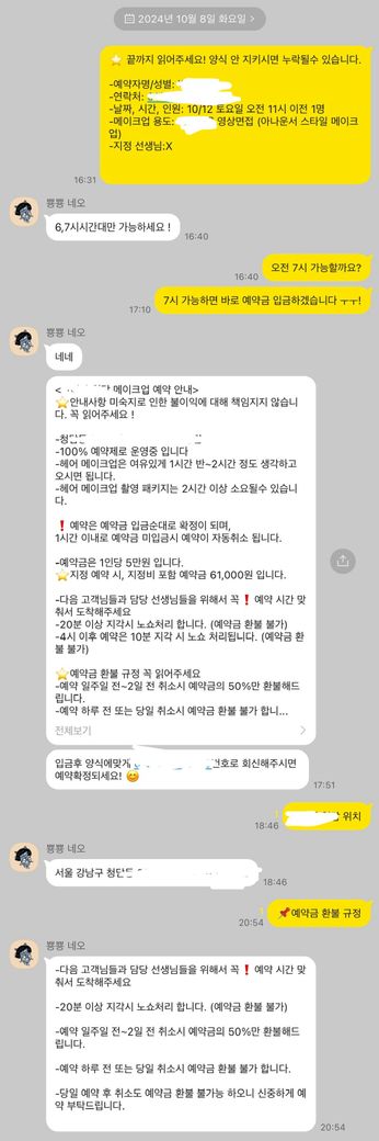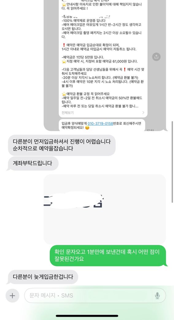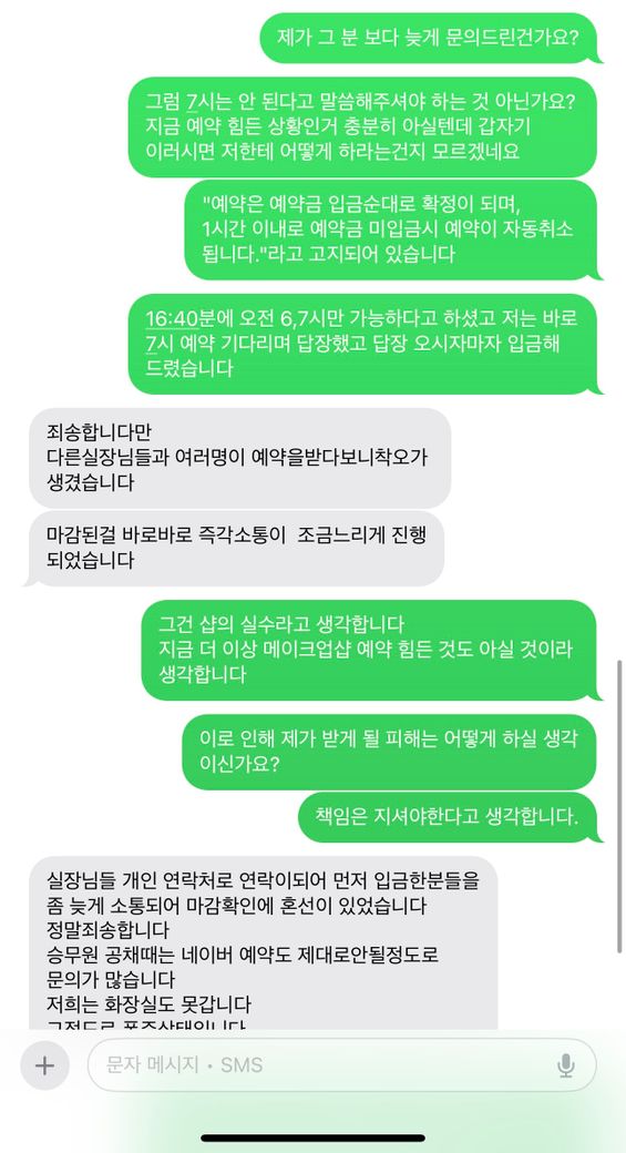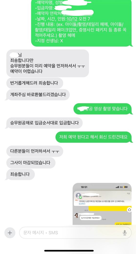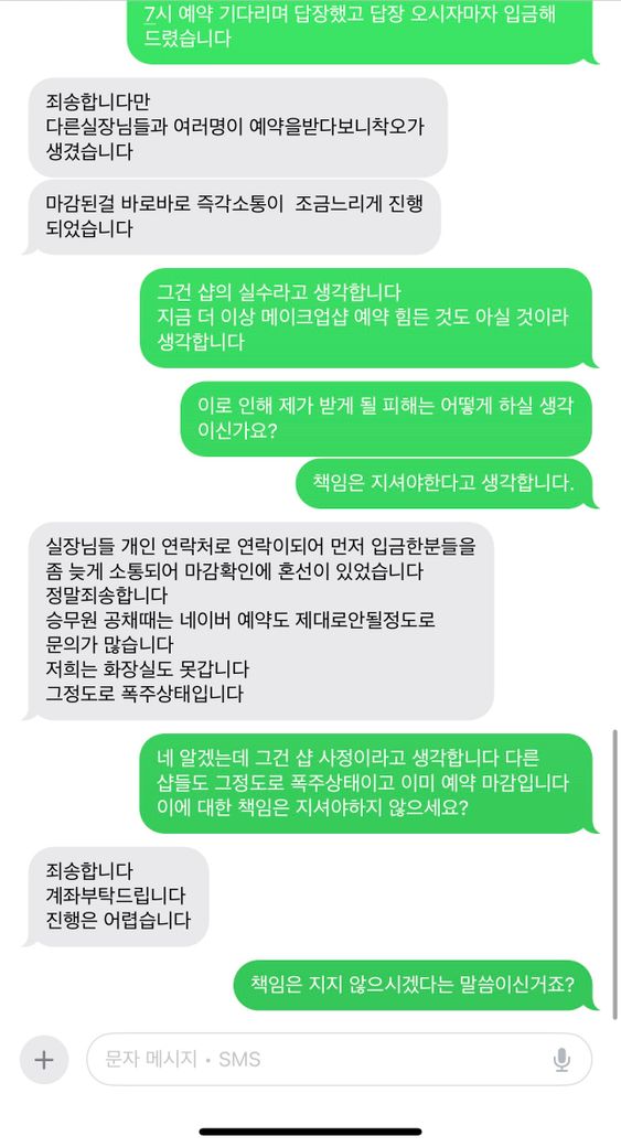중요한 공채가 진행 중이라 메이크업샵 예약을 했습니다. 하지만 샵의 실수로 중복 예약이 돼 저는 일방적으로 취소됐습니다. 현재 다른 메이크업 샵들도 모두 예약 마감이라 저만 큰 피해를 보고 있는 상황입니다. 아직 계좌는 안보냈습다. 이러한 경우 소보원에 신고를 하거나 피해보상 또는 고소가 가능한가요? (대화내용 첨부합니다)