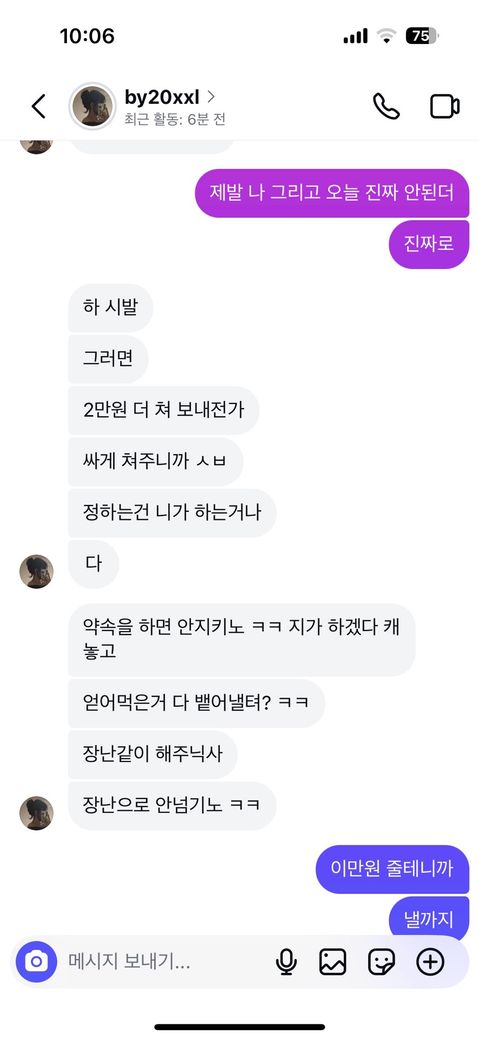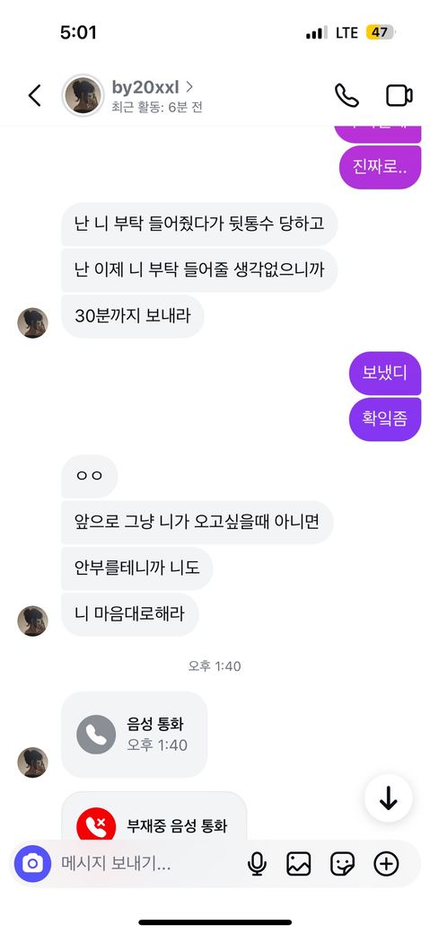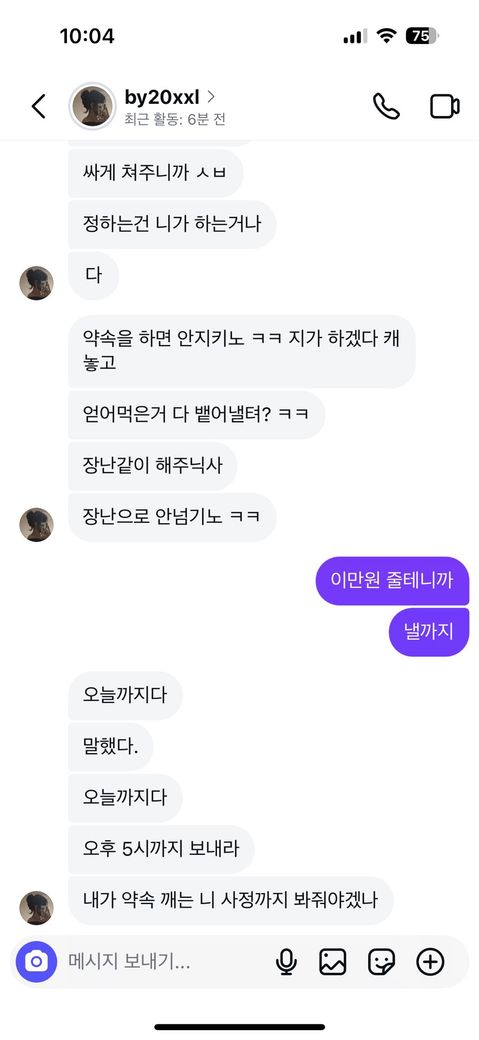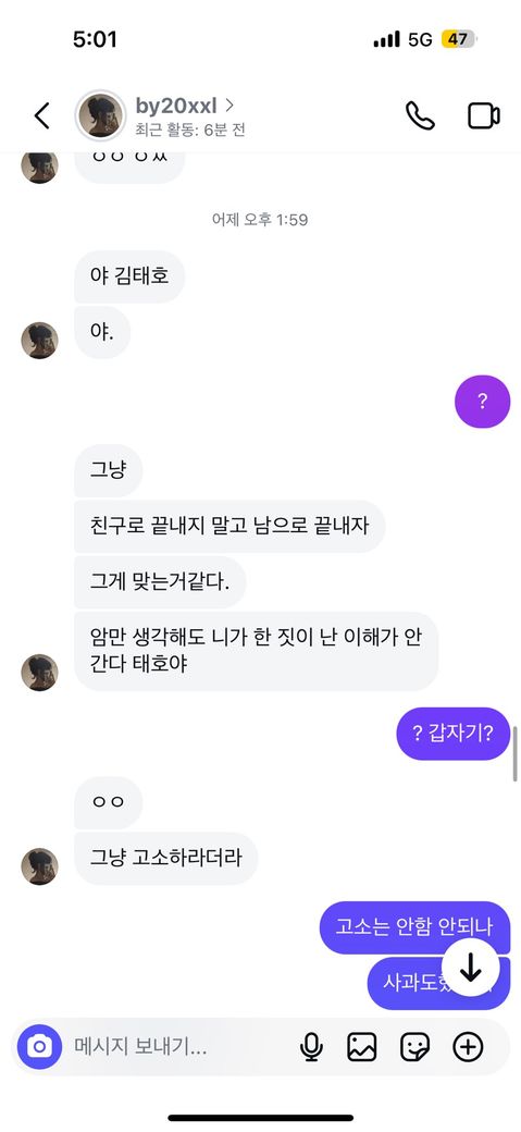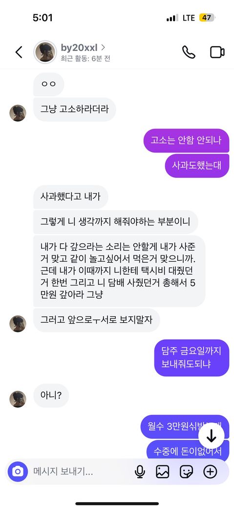 저번주 화요일에친구가모텔에서 자고가라고 해서 잔다말했다가 힘들것같다고 말하니까 5만원보내래서 보내고 다음날 못간다고 하니까 추가로 2만원5시까지 보내라말해서 조금 무서운마음에 용돈2만원만달라고 외삼촌 삼촌 엄마 아빠한테 디엠내역 캡쳐해서 보내고 부모님 외삼촌이랑 통화하고 전화로 번호달래서 번호준거가지고 얘가 정보통신법 위반이라고 외삼촌한테 말하고 나는 외삼촌한테 얘랑 놀기 싫다고 친구하기싫다고 말한거있고 그거듣고 얘나고소한다고 받기싫으면 사과하로 튀어오라하고 아빠도 빡쳐서 전화번호달라고해서 내가 드렸는데 아빠가 고소한다고 말했어 그리고 나는 외삼촌이랑 엄마 아빠한테 도와달라고 전화하고 카톡내역 보낸거가지고 부모님 삼촌 화나서 고소한다니 뭐니하면서 전화한거 녹취했다고 하면서 증인 증거있다하고 하면서 어제는 저 사진처럼 말하고 돈보내달라고해서 돈보내줬는데