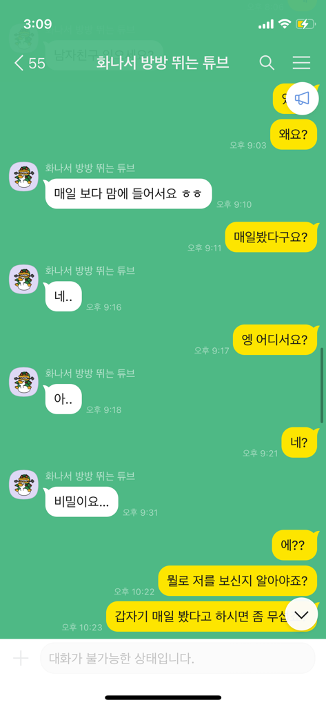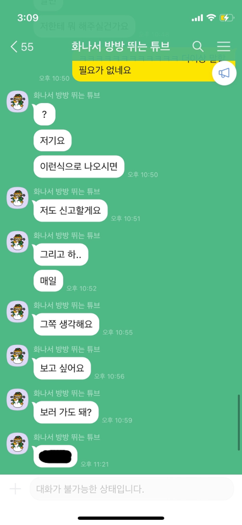채팅방에 어떤 한 분이 1:1 연락을 주셨고 노트북 가격과 정보에 대한 얘기를 하기 시작했습니다. 그러던 중 갑자기 남자친구가 있냐며 이상한쪽으로 빠지더니 점점 선을넘는 발언을 하기 시작했습니다. 오피스텔 오픈채팅은 익명이여서 저에 대한 정보를 알 수가 없는데 매일 보고있다, 사귀자로 시작해서 보러온다고까지 얘기를하니 너무 소름끼쳐서 집에 가기가 무섭고 싫어집니다.. 아래는 대화 캡쳐본입니다