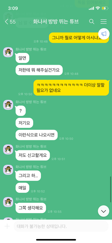 일단 범죄의 우려가 있으신 부분에 대해서는 경찰에 신고를 하시어 도움을 받으시면 되겠고, 오픈채팅방은 대화를 중단하시고 방을 나오시는 것도 방법이 될 수 있겠습니다.